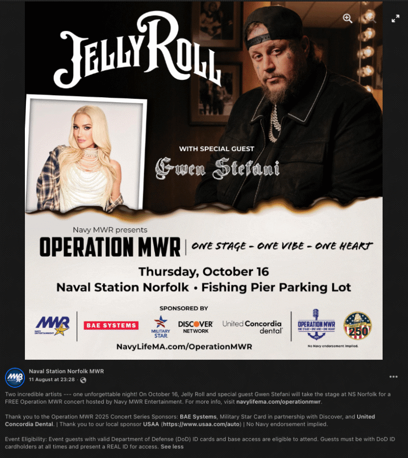 The show will happen at Pier 14 Parking Lot, with the stage shining against the Norfolk sky. Only people with Department of Defense ID cards and their guests are allowed to attend. It will be a night of joy and togetherness. With Jelly Roll’s strong voice and Gwen’s bright energy, every song will feel like it was made just for you.